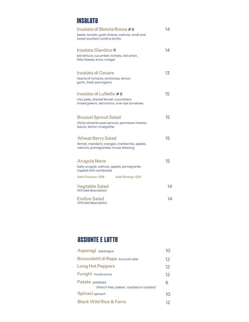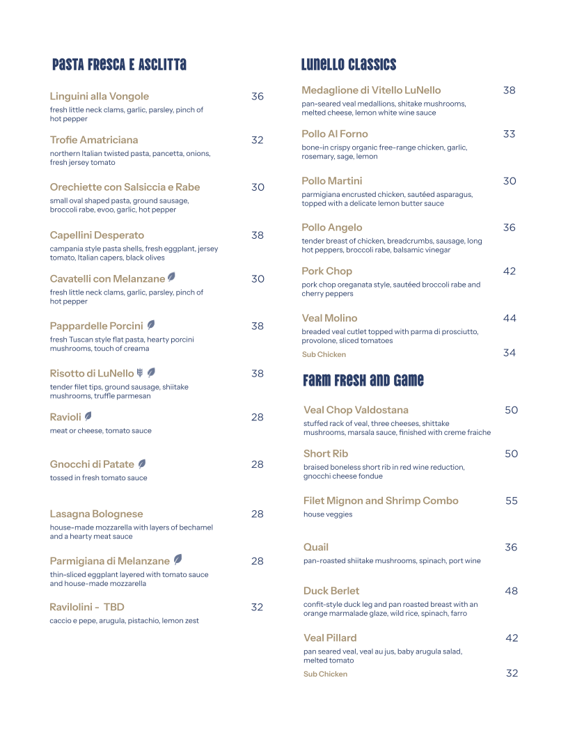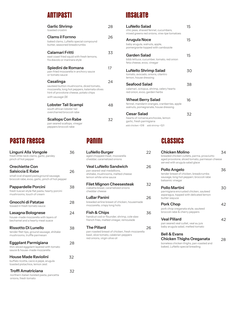 To close the meal, classic desserts like Brownie a La Mode and Caramel Flan lend a comforting sweetness, perfectly suited to a calm and inviting evening. Whether sharing a casual dinner with friends or marking a special occasion, Lu Nello’s menu supports a dining experience that feels both familiar and thoughtfully crafted.